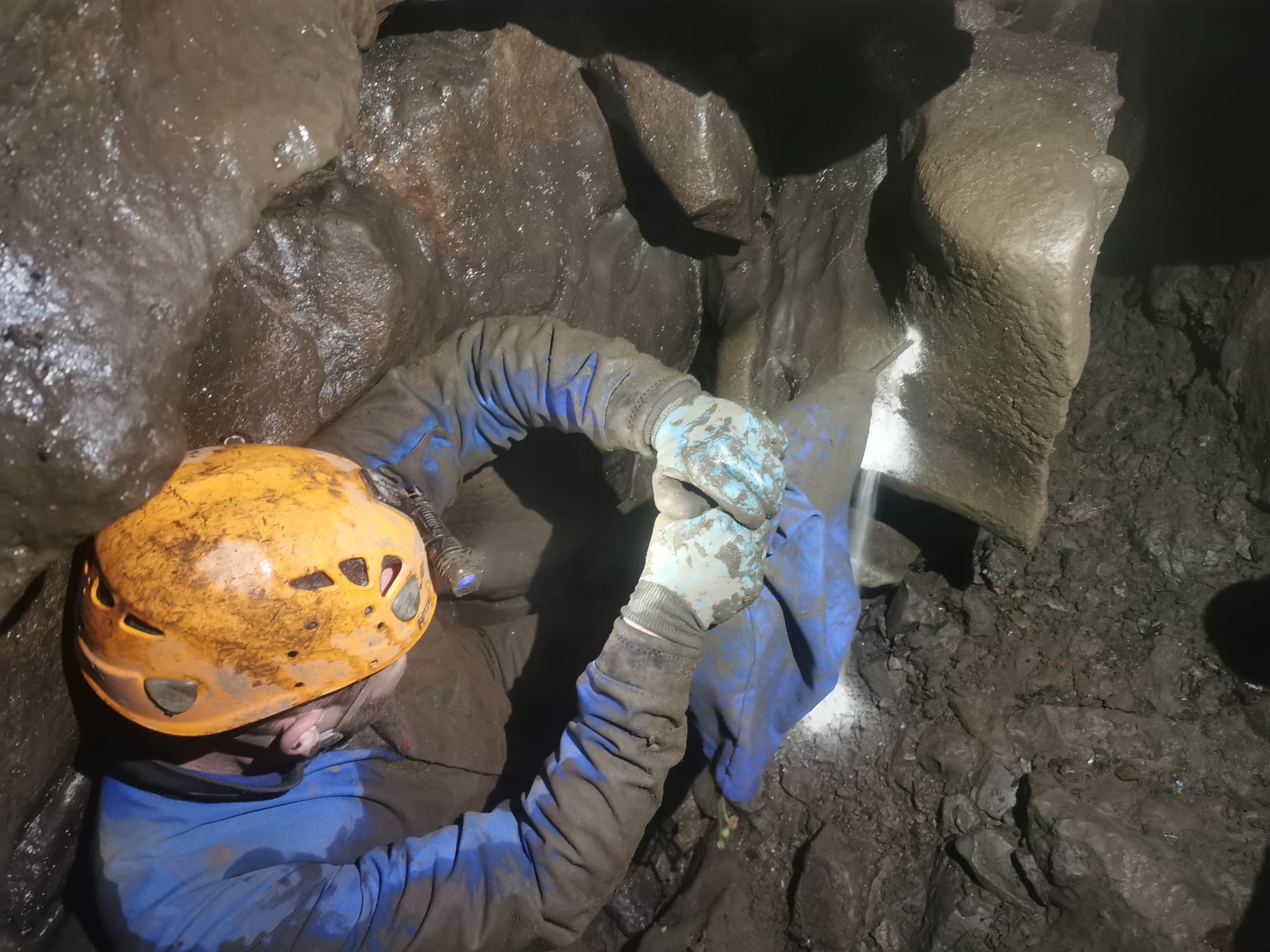 With the way on clear and with a bit more space created it was now possible to get in another body length. With time ticking on we thought it would be a good idea for one of us to head back round and see how good the voice connection was, so back through Ward Wins I went. Reaching the other side I could clearly hear Rob straight on not only that I was sure I could see his light. I switch my lamp off and a couple of seconds later, through the small rift, I could see Rob had taken his helmet off, put it on the ground and could now clearly see his light. There was around 1.5 - 2m between where we stopped capping and Robs light.