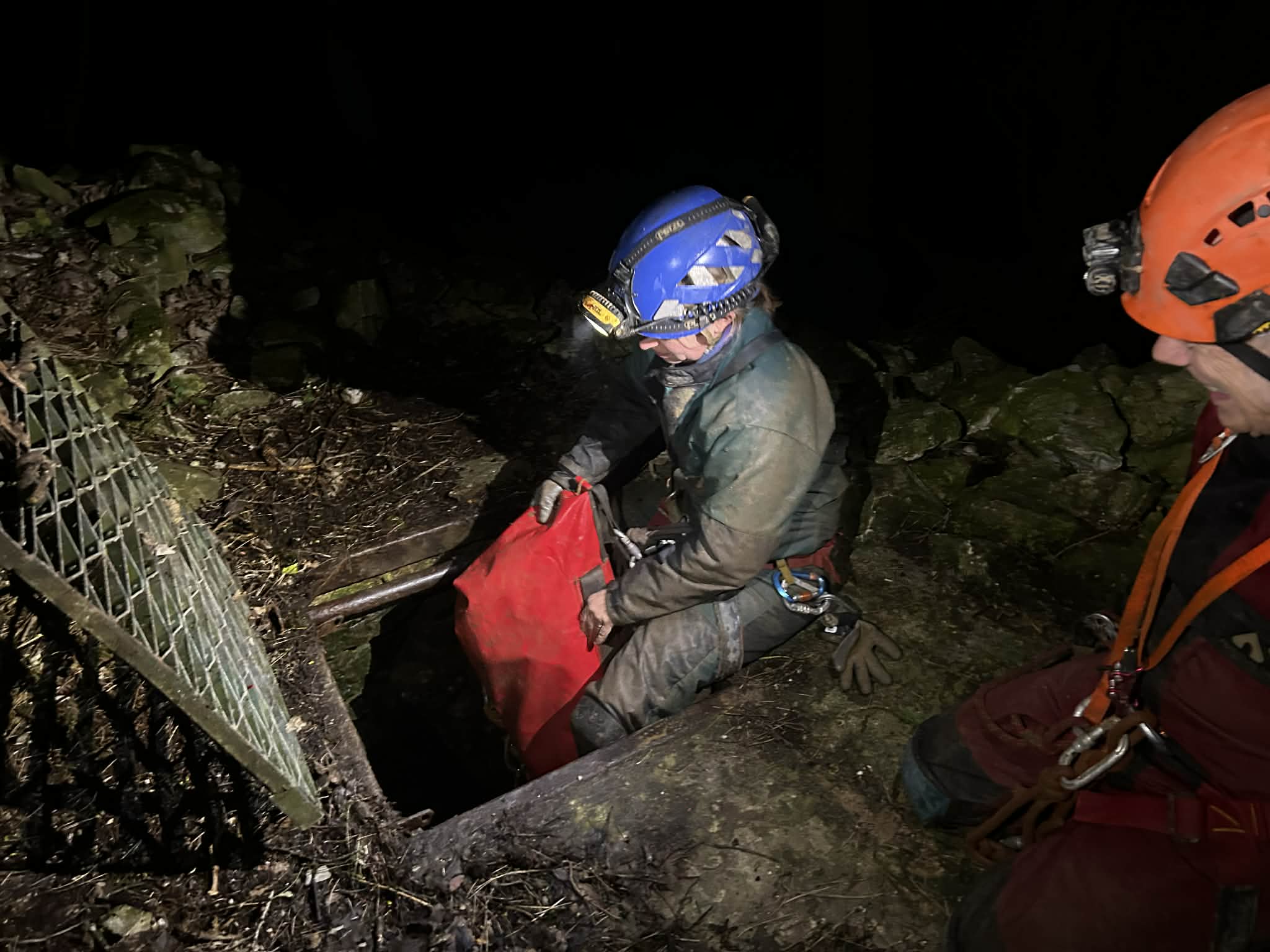 Eventually we all wandered off toward our respective exits. The climbing shaft did not disappoint—still one of my favourites—and with only three of us plus Katie derigging, we made tidy progress and popped out into a rare Peak District February evening no rain, visible stars, and even a quarter moon above. Katie popped the frog out of her glove. He had survived unscathed. I let him go in the small copse of trees. We hope he wanted to reach the surface after all.